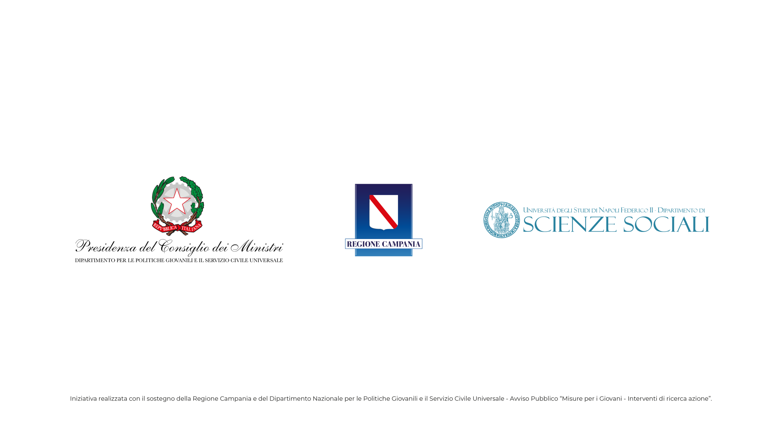 “Iniziativa realizzata con il sostegno della Regione Campania e del Dipartimento Nazionale per le Politiche Giovanili e il Servizio Civile Universale – Avviso Pubblico “Misure per i Giovani -Interventi di ricerca azione”.